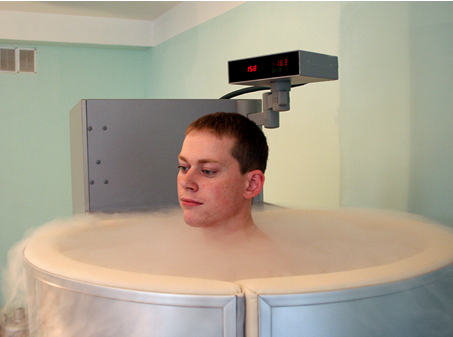 Рис.2 Криотерапевтическая процедура в индивидуальном комплексе «КАЭКТ-01 « КРИОН». Незначительная мощность электрооборудования индивидуальных криотерапевтических комплексов, объясняется тем, что основным источником холода в этих аппаратах является жидкий азот. Использование криоагента, позволяет отводить мощные тепловые потоки при минимальных затратах энергии. Например, использование 1 кг жидкого азота в минуту создает на температурном уровне 140 К холодопроизводительность 4,3 КВт []. Учитывая то, что установки рассчитаны на индивидуальные процедуры при расходе криоагента 1−2 кг/мин, они легко покрывают тепловыделения от поверхности тела паци-ента (около 5 кВт см. табл.2). Альтернативное направление – аппараты для групповых процедур представлены в табл. 4. Групповые системы снабжены компрессионными охладителями. Криосауна «КРИО СПЕЙС» является продуктом немецкой фирмы «Medizintechnik». Охладитель этой установки представляет собой трехкаскадную холодильную машину.