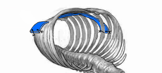 Затем край пластины загибаем по форме грудной клетки. С каждой стороны через отверстия в пластине накладываем фиксирующие швы к двум подлежащим ребрам (рис. №7). Обязательно следили, что бы с каждой стороны пластина опиралась и фиксировалась минимум к двум ребрам.