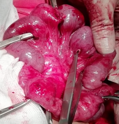 Рис 3 – интраоперационное фото. Видны множественные перфорации тонкой кишки.