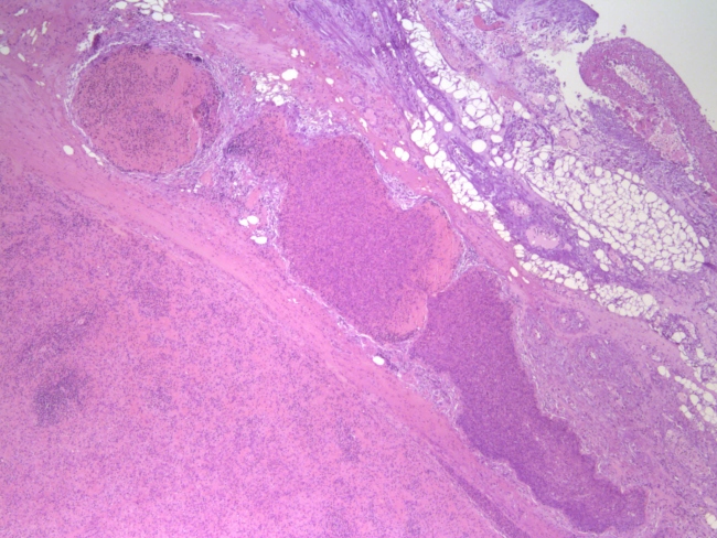 Figure 13 - une micropréparation d'une rate prélevée. Augmentation x 400, coloration a l`hématoxyline-éosine. Des zones de tissu adipeux avec des vaisseaux fortement congestionnés, une stase, une infiltration leucocytes segmentaires, des lymphocytes, des agregations focales d'exsudat fibrineux-leucocytaire.