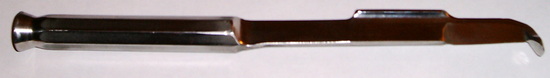 Делается это для того, чтобы не повредить прилежащие к грудине органы: аорта, перикард. Но при подъёме грудины стернотом может срываться и выскакивать в рану. Чтобы этого не происходило, мы несколько модифицировали серийно выпускаемый стернотом. На конце режущей его части имеется булавовидное расширение в диаметре 1,0-1,5 см. Это расширение препятствует выскакиванию стернотома в рану при рассечении грудины.