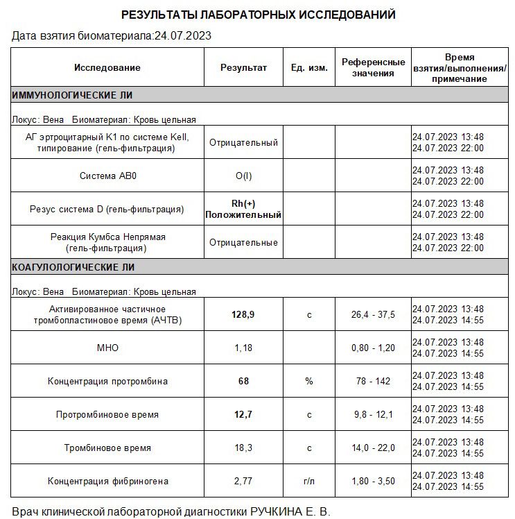 В общем анализе крови патологии нет. Выполнена коагулограмма - АЧТВ 128с, протромбин 68%. Выполнена также тромбоэластограмма. Лабораторный образец, поступивший в лабораторию на исследование гемостаза, был использован для наработки опыта сотрудников врачей-лаборантов и трансфузиолога использования прибора тромбоэластометра ROTEM. В процессе получения результата исследования, учитывая исходный изолированный резко увеличенный уровень АЧТВ, выявлены признаки коагулопатии, было заподозрено наличие гемофилии. Для дальнейшего обследования и лечения переводится в отделение гаматологии Морозовской ДГКБ, где был установлен диагноз гемофилии В. При определении IX фактора концентрация его менее 1%. Установлена тяжелая форма гемофилии В.