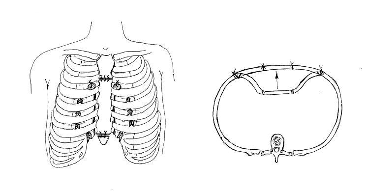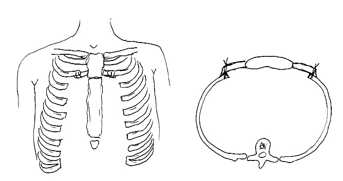 Выполняется один (у мальчиков) или два (у девочек) поперечных разреза кожи. Отслаиваются кожные лоскуты в пределах деформации. Тупым способом разделяются грудные мышцы только над деформированными реберными хрящами, которые удаляются с сохранением надхрящницы. Реберные дуги отсекаются от грудины и укорачиваются на 3-4 сантиметра каждая. Затем выполняется поперечная или косая (при асимметричных формах) клиновидная стернотомия у верхней границы деформации. За грудину устанавливается и фиксируется к ребрам титановая пластина, изогнутая по форме грудной клетки. Реберные дуги подшиваются к грудине поверх пластины. После дренирования загрудинного пространства рана послойно ушивается наглухо с наложением косметического шва на кожу (рис. 12).